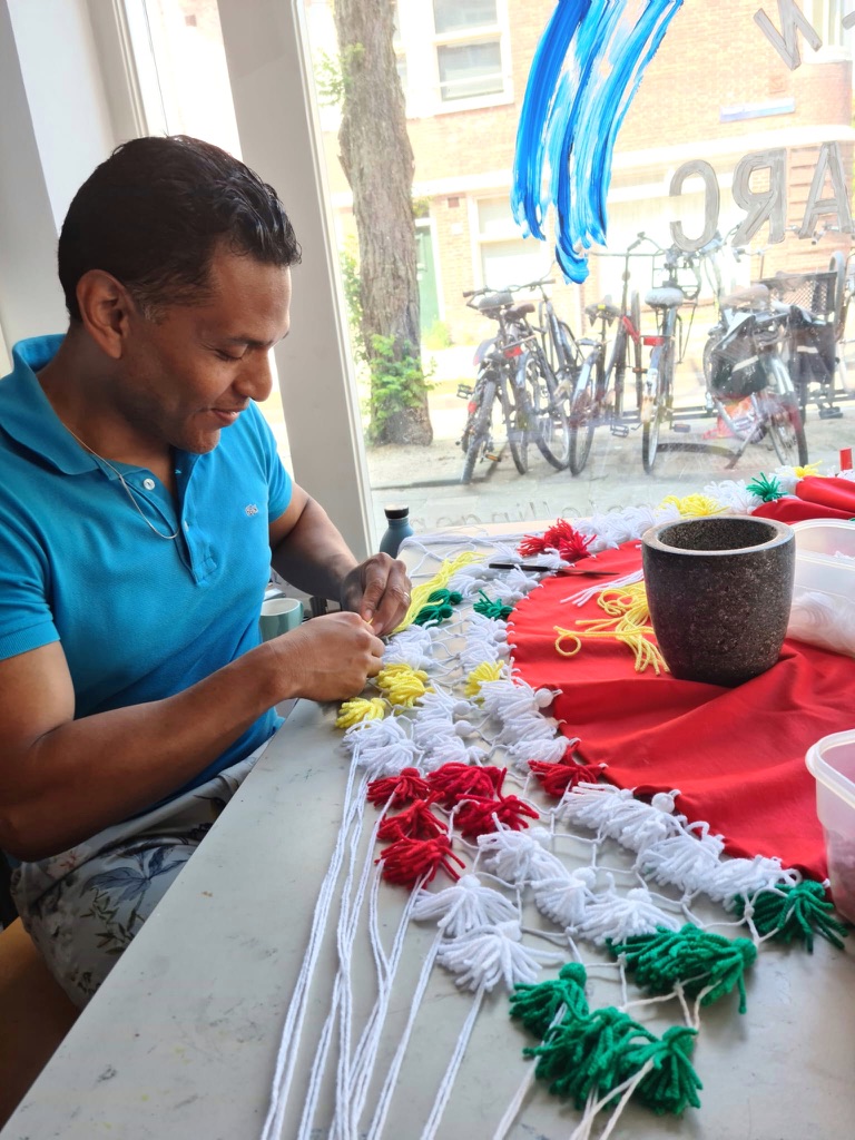 As part of his artistic research into grief, embodiment, and Indigenous knowledge, Dwayne Toemere facilitated a workshop series in collaboration with Stichting Wasjikwa during May and June 2025. The series focused on the creation of personal shoulder cloths: symbolic garments often worn in acts of remembrance and resistance, crafted from alakondre fabric, which itself represents unity in cultural diversity.